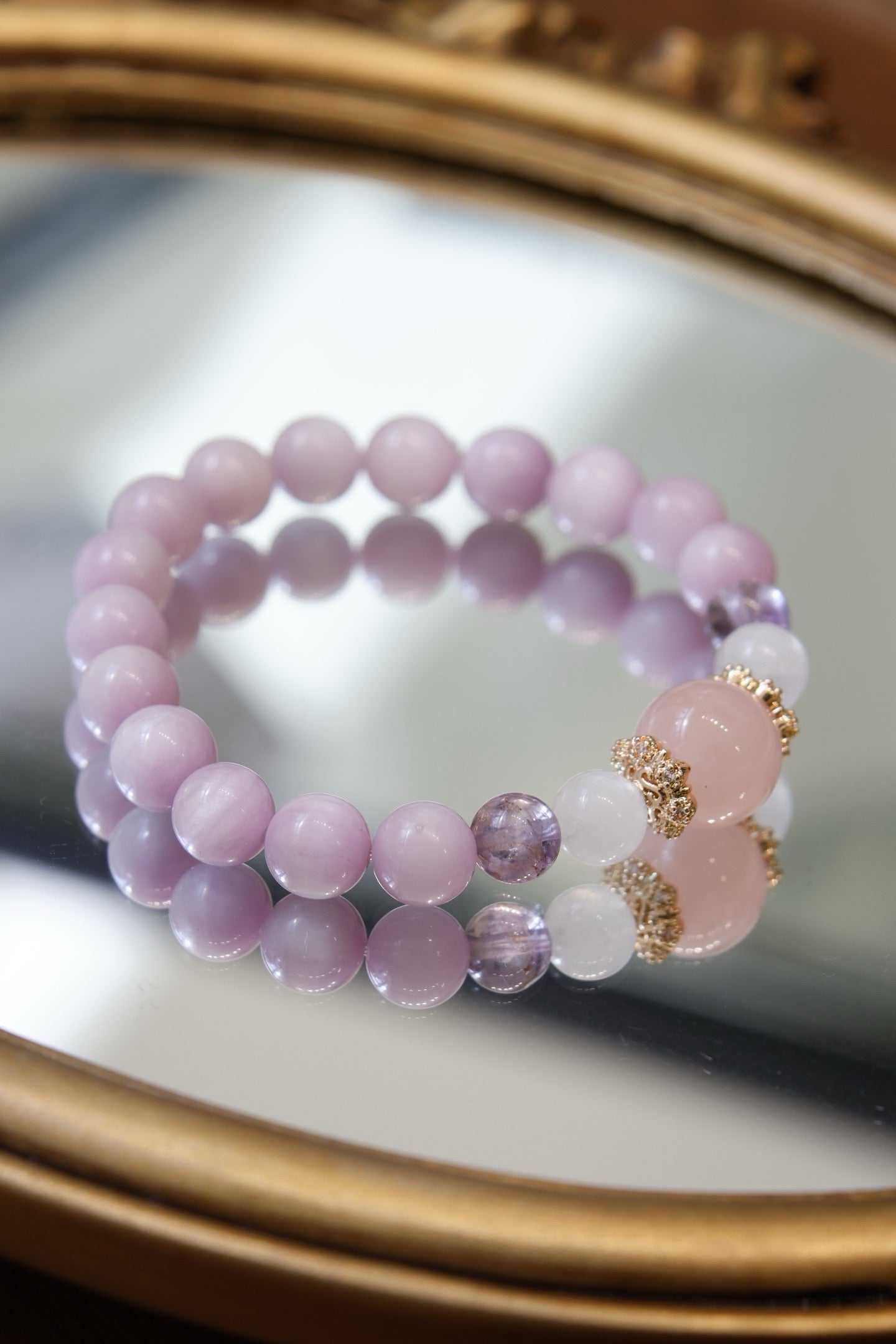 Kunzite, revered as the *Stone of Evening Soirées*, glows in a whisper of lavender-soft lilac, its texture as delicate as a moonlit veil.
